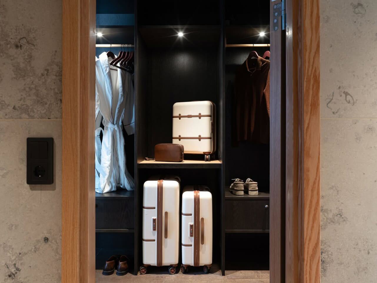 Insidan är smart och lyxigt designad. Resväskan har två delar för att enkelt kunna separera din packning. Den ena delen har ett förslutningsbart fack med en stor ficka utanpå med dragkedja för att kunna packa mindre tillhörigheter. Den andra delen, dvs. bottenfacket, har elastiska kryssband som håller packningen på plats. Insidan är skapad i ett exklusivt foder med Printissos ikoniska P för en unik och lyxig känsla.