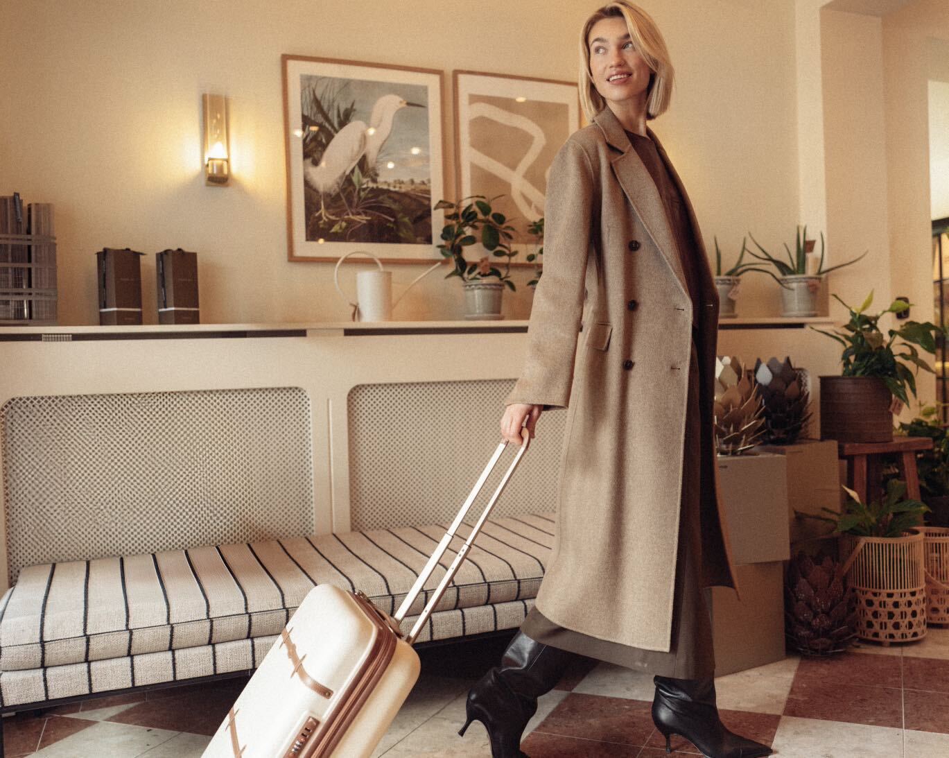 Teleskophandtaget är stabilt och justerbart på flera nivåer för en enkel manövrering. Skenan är i matt guld som matchar väskans detaljer. Ovansidan har ett bekvämt och starkt bärhandtag för smidig hantering.