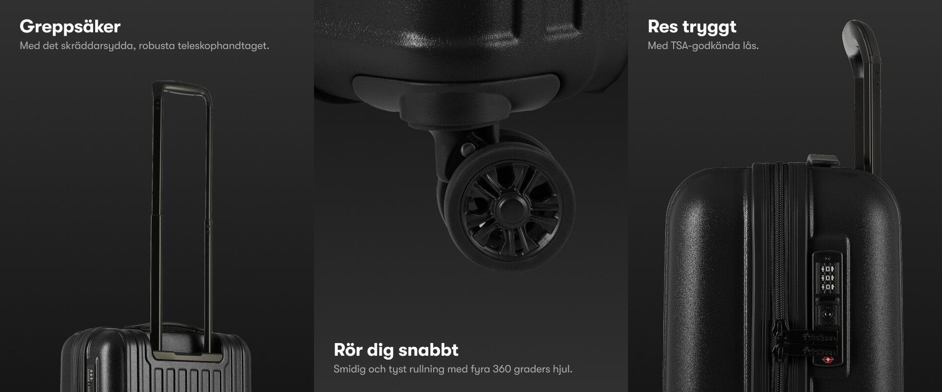 Teleskophandtaget är stabilt och justerbart på flera nivåer. Skenan är i mattsvart med matchande handtag. Upptill på väskan sitter ett bekvämt bärhandtag för smidig hantering.