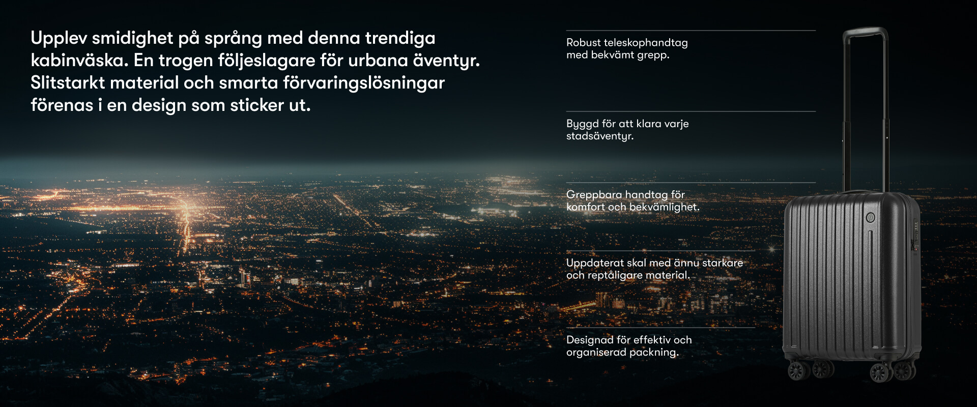 Printisso Urbane är för dig som letar efter en lätt, hållbar och stilren kabinväska med komponenter som tål att testas. Urbane är gjord i ett hårt, lätt och slitstarkt material som garanterar en lång livslängd med 5 års heltäckande garanti. Designen är tidlös med hörn som utvecklats för maximal packningsvolym och stöttålighet. Serien Urbane kommer i tio smakfulla färger. Dröm dig bort med snygga färgen Onyx Black. Kabinväskan är perfekt för en kortare weekendresa eller en affärsresa på 2-3 dagar. Måtten är framtagna för att klara alla flygbolag men passar även väl för både tåg- och bilresor. Resväskan levereras i en snygg dustbag som skyddar den under transport och förvaring.