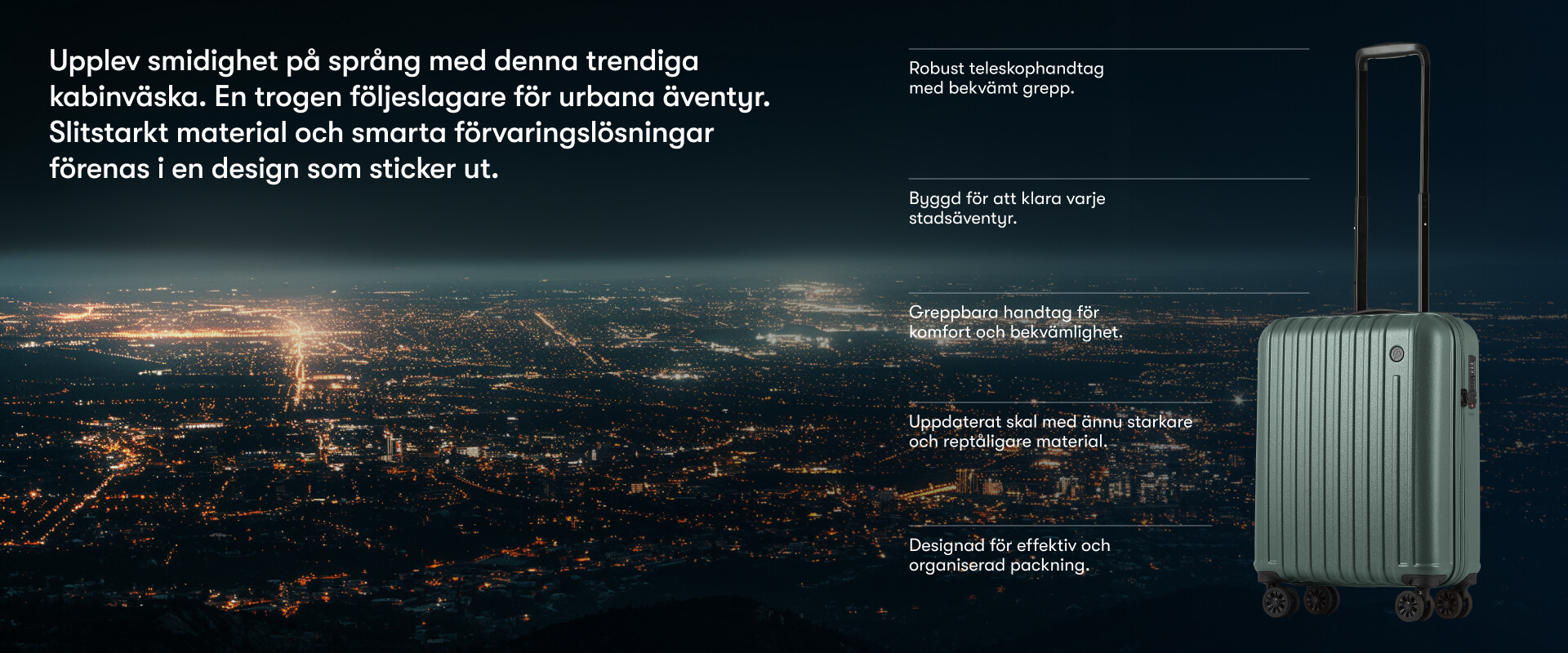 Printisso Urbane är för dig som letar efter en lätt, hållbar och stilren kabinväska med komponenter som tål att testas. Urbane är gjord i ett hårt, lätt och slitstarkt material som garanterar en lång livslängd med 5 års heltäckande garanti. Designen är tidlös med hörn som utvecklats för maximal packningsvolym och stöttålighet. Serien Urbane kommer i tio smakfulla färger. Dröm dig bort med snygga färgen Shadow Green. Kabinväskan är perfekt för en kortare weekendresa eller en affärsresa på 2-3 dagar. Måtten är framtagna för att klara alla flygbolag men passar även väl för både tåg- och bilresor. Resväskan levereras i en snygg dustbag som skyddar den under transport och förvaring.