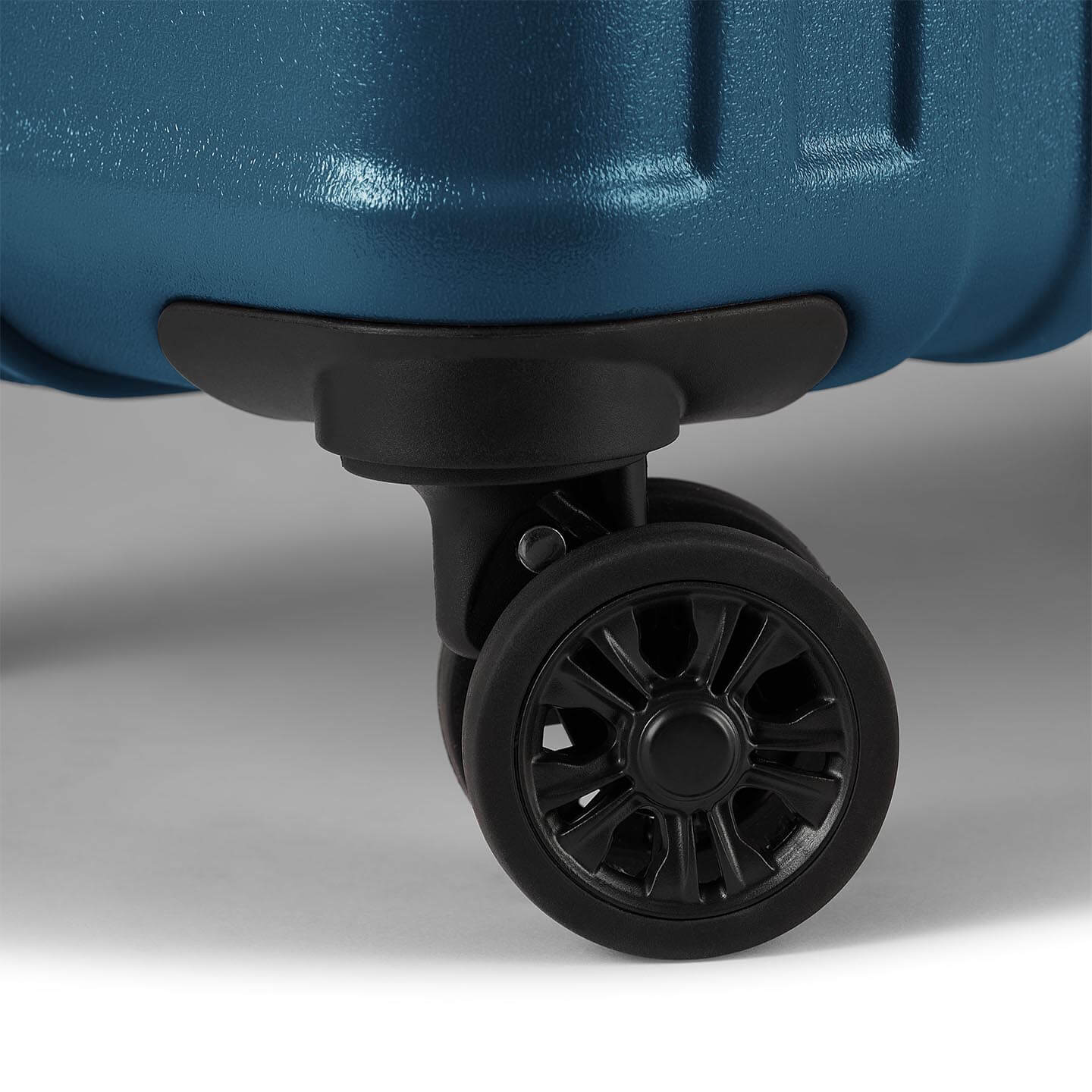 Fyra stabila, lättrullande och tystlåtna dubbelhjul som garanterar en smidig resa på alla typer av underlag. Hjulen kan vridas 360° och rullas i olika riktningar för enkel manövrering.