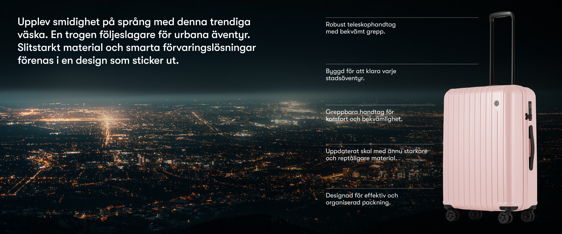 Printisso Urbane är för dig som letar efter lätta, hållbara och stilrena resväskor med komponenter som tål att testas. Urbane är gjord i ett hårt, lätt och slitstarkt material som garanterar en lång livslängd med 5 års heltäckande garanti. Designen är tidlös med hörn som utvecklats för maximal packningsvolym och stöttålighet. Serien Urbane kommer i tio smakfulla färger. Dröm dig bort med snygga färgen Soft Pink. Kabinväskans mått är godkänd utav alla flygbolag och passar för en kortare weekendresa eller en affärsresa på 2-3 dagar. Mellanstorleken går att checka in på alla flygbolag och är perfekt för en resa på 4-7 dagar. Stora storleken går att checka in på alla flygbolag och passar för en resa på 7-14 dagar. Alla storlekar passar även väl för både tåg- och bilresor. Resväskorna levereras i snygga dustbags som skyddar dem under transport och förvaring.