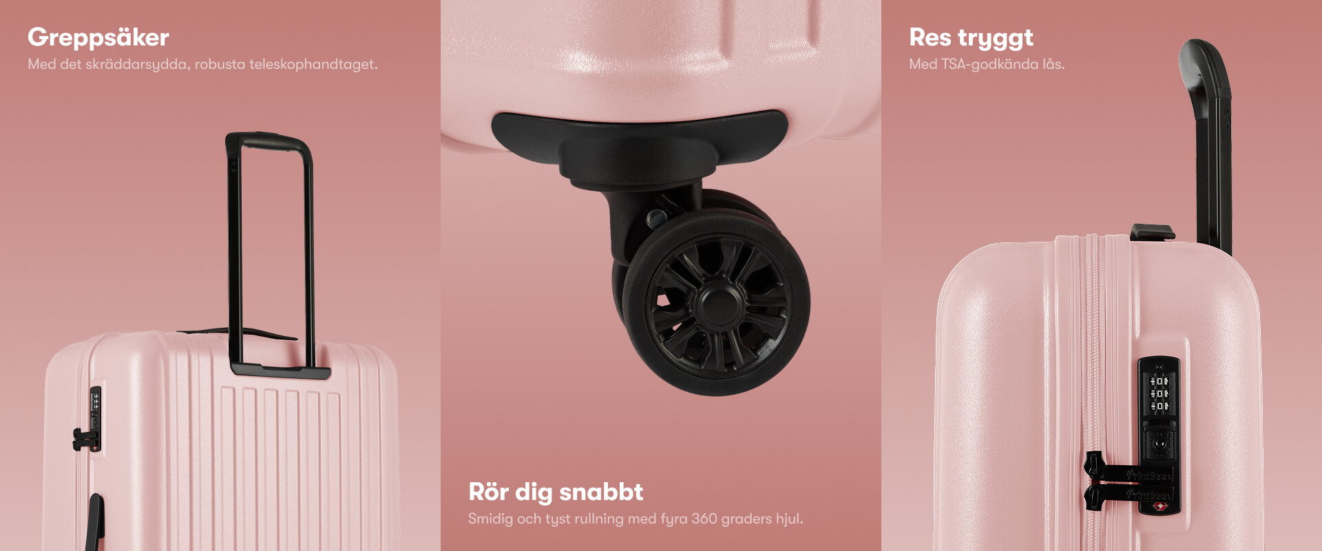 Teleskophandtaget är stabilt och justerbart på flera nivåer. Skenan är i mattsvart med matchande handtag. Kabinväskan har ett bärhandtag på ovansidan medan den mellanstora och stora resväskan har både ovansida- och sidohandtag.